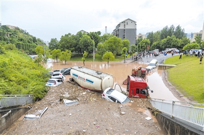 ▲ 7月14日,在重庆市万州区江南新区,停靠在路边的部分车辆陷在洪水淤泥里。