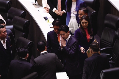 7月19日,在泰国首都曼谷,远进党党魁皮塔(中)离开国会。