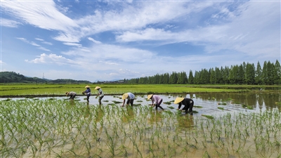 7月23日,在湖南省常宁市三角塘镇长江村,村民在抢插晚稻。
