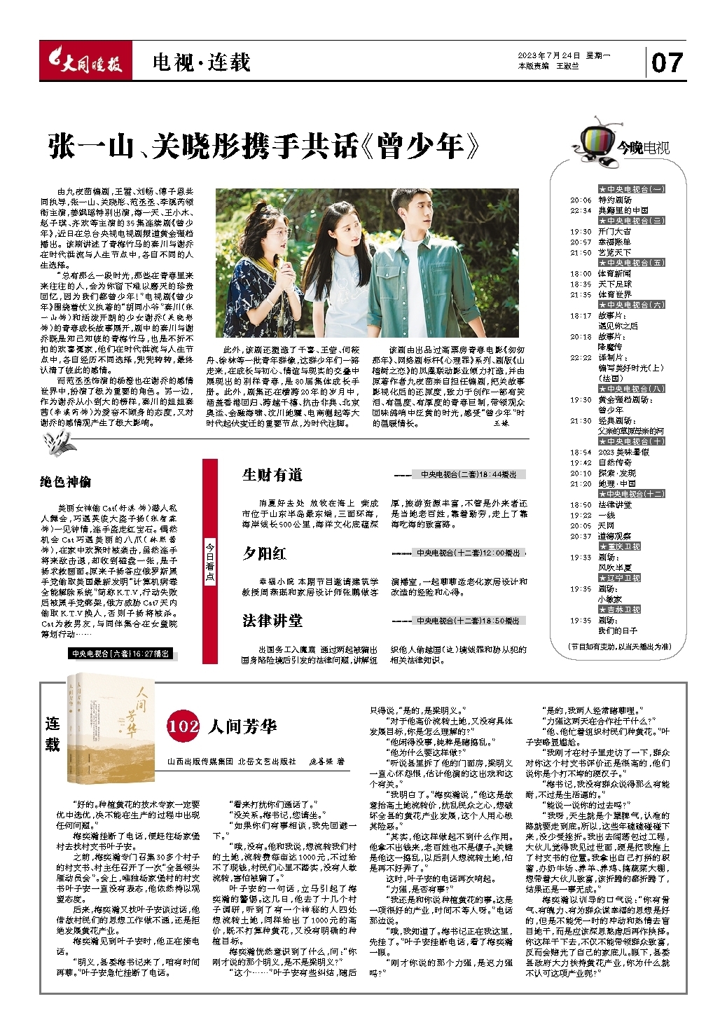 由九夜茴编剧,王雷、刘畅、傅子恩共同执导,张一山、关晓彤、范丞丞、李溪芮领衔主演,姜飒瑶特别出演,海一天、王小木、赵子琪、齐欢等主演的35集连续剧《曾少年》,近日在总台央视电视剧频道黄金强档播出。该刷讲述了青梅竹马的秦川与谢乔在时代洪流与人生节点中,各自不同的人生选择。