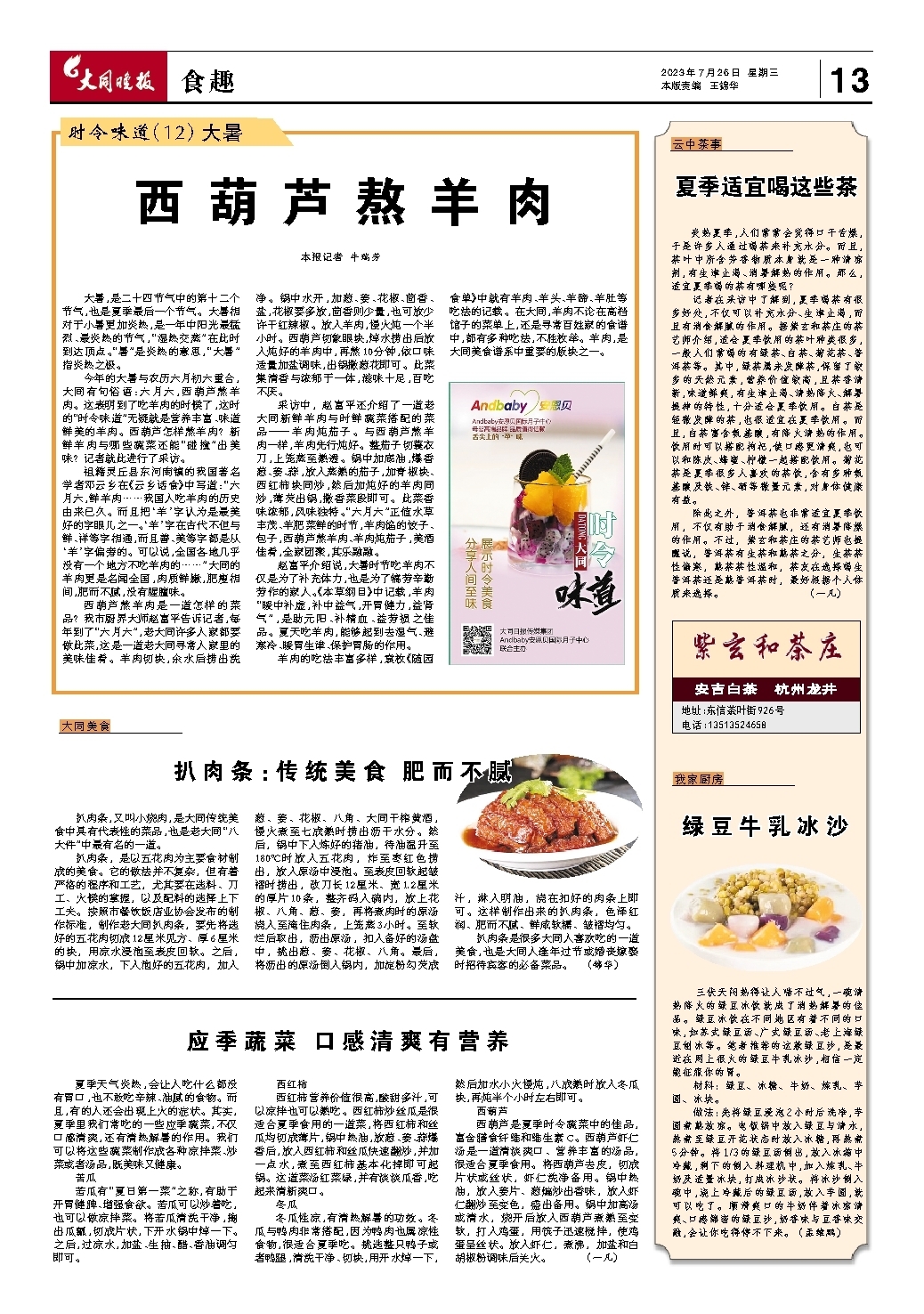记者在采访中了解到,夏季喝茶有很多好处,不仅可以补充水分、生津止渴,而且有消食解腻的作用。据紫玄和茶庄的茶艺师介绍,适合夏季饮用的茶叶种类很多,一般人们常喝的有绿茶、白茶、菊花茶、普洱茶等。其中,绿茶属未发酵茶,保留了较多的天然元素,营养价值较高,且茶香清新,味道鲜爽,有生津止渴、清热降火、解暑提神的特性,十分适合夏季饮用。白茶是轻微发酵的茶,也很适宜在夏季饮用。而且,白茶富含氨基酸,有降火清热的作用。饮用时可以搭配枸杞,使口感更清爽,也可以和陈皮、蜂蜜、柠檬一起搭配饮用。菊花茶是夏季很多人喜欢的茶饮,含有多种氨基酸及铁、锌、硒等微量元素,对身体健康有益。