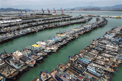 7月27日,渔船停泊在福建厦门高崎闽台中心渔港躲避台风(无人机照片)。