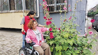 为闫晓霞服务结束后,两位工作人员又马不停蹄地赶到同丰小区,来到从小患有类风湿关节炎的张艮芳家。虽然患病多年,生活几乎不能自理,但性格开朗的张艮芳喜欢坐轮椅外出。“我们除了帮她收拾家务,还陪她在外面散心,赏赏花看看景,让她尽量多呼吸一些新鲜空气,这样心情会更好。”一位工作人员边推轮椅边说。