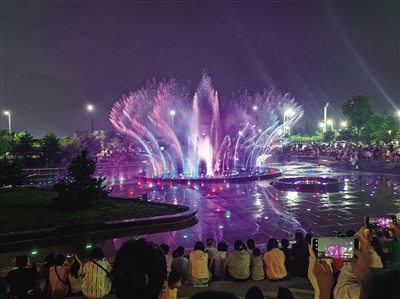 绿轴景观带音乐喷泉再次回归,加上正值暑假旅游高峰,吸引了众多市民游客前来观赏。