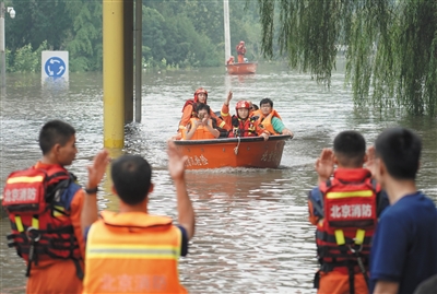 ▲8月2日,在北京市房山区的京港澳高速琉璃河出口,受灾群众乘坐冲锋舟前往转运车辆乘车点。