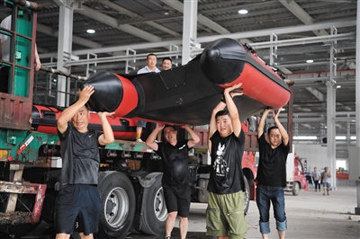 ◀8月5日,工作人员和志愿者在河北省涿州市钢研物资储备点内搬运捐赠的冲锋舟。