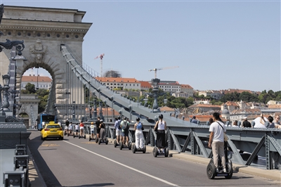 ◀8月4日,在匈牙利布达佩斯,游客骑着两轮平衡车从链子桥上经过。