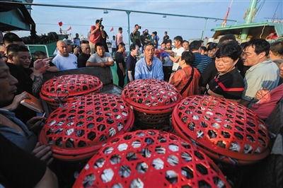 8月6日东海部分解禁开渔,浙江舟山市首批申请了专项捕捞特许的渔船(桁杆拖虾、笼壶类、刺网和灯光围(敷)网四种类型渔船)结束休渔,开赴东海海域,进行捕捞作业。渔运船和渔船一同抵达作业渔场,捕捞上来的鱼获由渔运船先行送回港口码头,渔船则留在海上继续生产,因此8月7日首批新鲜的梭子蟹、鲳鱼、大小黄鱼等就能来到沈家门渔港,丰富百姓的餐桌。 本版文图据新华社