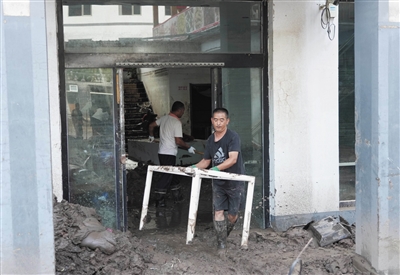 ▲8月8日,涞水县三坡镇下庄村的村民在搬运家具。