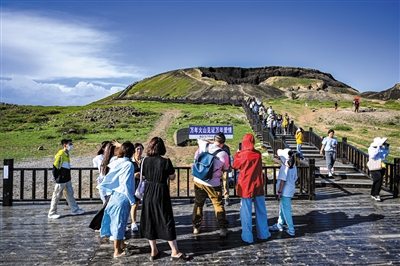 ▲8月6日,游客在乌兰察布市察哈尔右翼后旗草原上的火山前合影留念。