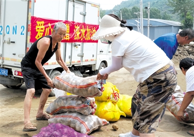 ▲ 8月10日,涞水县赵各庄镇李各庄村的村民在搬运爱心人士捐赠的蔬菜。