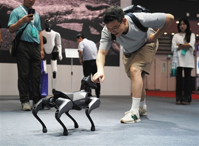 8月16日,观众在2023世界机器人大会现场与一款仿生四足机器人互动。