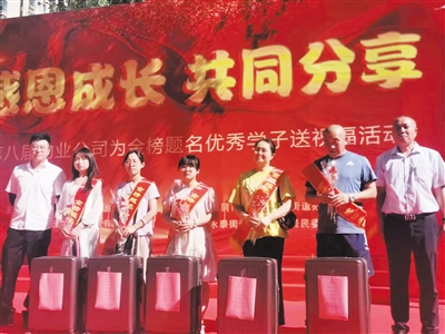本报讯 (记者 邸东芳) 感恩成长,共同分享。13日上午,御滨花园、金港丽城等6个小区顺利升入高中、大学的67名莘莘学子齐聚御滨花园小区,接受由市“河东”“云波”物业公司为优秀学子送上的爱心祝福。