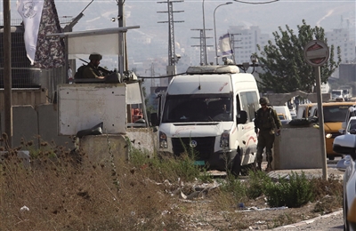 ▼ 8月19日,在约旦河西岸城市纳布卢斯以南的胡瓦拉镇,以色列士兵在袭击事件现场附近的一个检查站执勤。