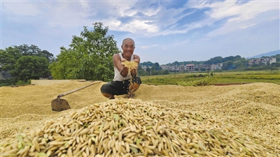 8月20日,湖南省常宁市板桥镇西洞村农民展示刚收获的稻谷。