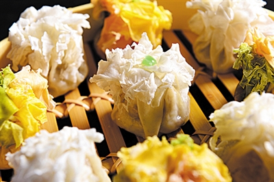 赵富平介绍说,优质的烧麦,皮要薄如蝉翼,馅要鲜、嫩、滑、爽、弹。包烧麦时,左手拿皮,摊在掌心,右手用挑子挖上馅料放在烧麦皮中心一顶,左手顺势收拢,一步成形。只有这样,蒸出来的烧麦才会开花,像鼓胀的石榴一样。蒸熟的烧麦,口感软润,馅中有汁。吃到嘴里,要能感受到汤汁在嘴里的汩动。
