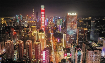 8月26日是深圳经济特区成立43周年。25日晚,深圳以夜空为幕,以灯光为笔,点亮市区主要建筑为特区庆生。