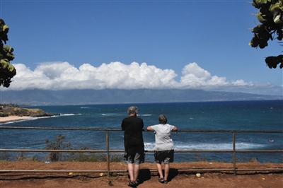 8月23日,两名游客在美国夏威夷毛伊岛一处海滩观景。