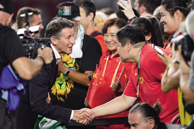 8月27日,世界田联主席塞巴斯蒂安·科(左)在闭幕式上与中国选手巩立姣握手。