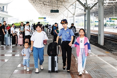 8月30日,工作人员在泰州站帮助旅客进站乘车。