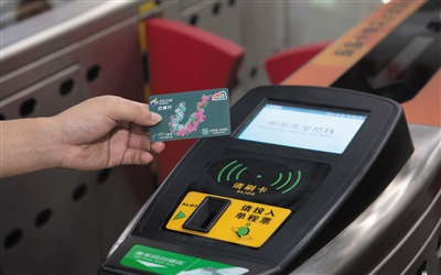 ◀8月30日,在深圳福田站地铁闸机出口,用户持深港互通行卡准备刷卡。