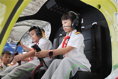 ▲8月30日,在德清县通航智造小镇莫干山机场,雷甸镇中心小学学生在驾驶舱内体验模拟飞行。