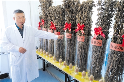 9月3日,黑龙江省农科院绥化分院水稻品种育种所所长聂守军在标本室介绍种植品种情况。