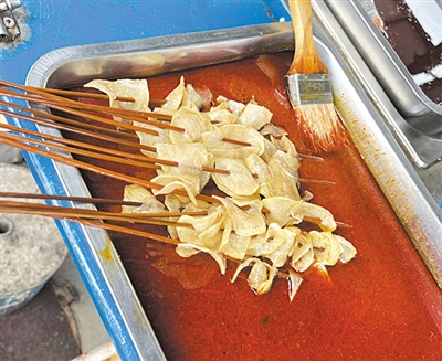 住在新华街的小伙伴应该都知道这家小摊,记者记得上小学时就在金源超市门口吃过,满载着童年的回忆。现在小摊位于新华街高层小区的巷子里,豆腐皮1元5串,3元起售。牛肉小串用的牛肉品质很好,吃起来特别嫩。蘸料是偏辣的,如果你不太能吃辣,就别再另外撒辣椒粉了。经营小摊的阿姨每天下午4时左右出摊,只卖豆腐皮和牛肉串,卖完就回家。