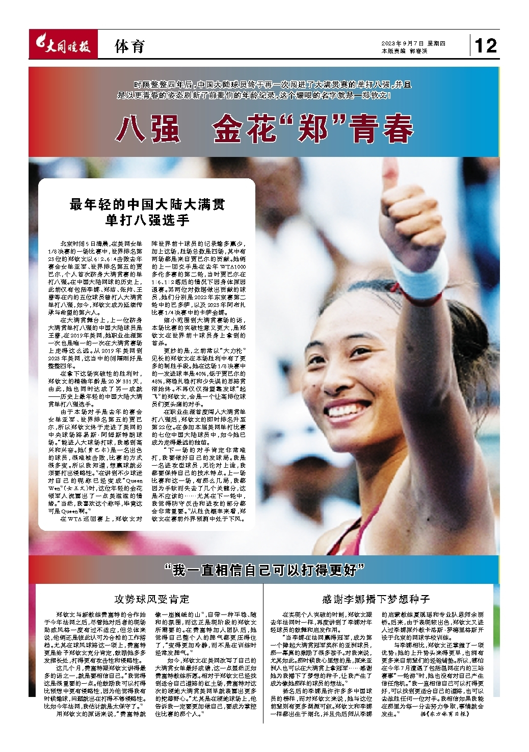 时隔整整四年后,中国大陆球员终于再一次闯进了大满贯赛的单打八强,并且是以更青春的姿态刷新了前辈们的年龄纪录,这个耀眼的名字就是—郑钦文!~~~