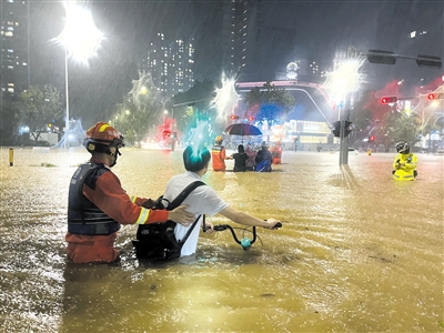9月7日,深圳市消防救援支队消防救援人员在深圳市龙岗区愉龙路积水严重区域帮助市民转移。