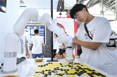 9月6日,参观者在数博会上与5G智能机器人下围棋。