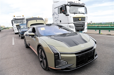 这是在霍尔果斯公路口岸等待出口的国产新能源汽车(9月6日摄)。