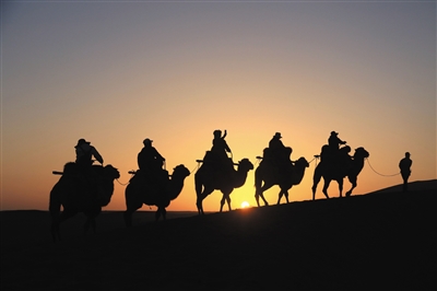 9月9日,游客在甘肃省敦煌市鸣沙山月牙泉景区游览。