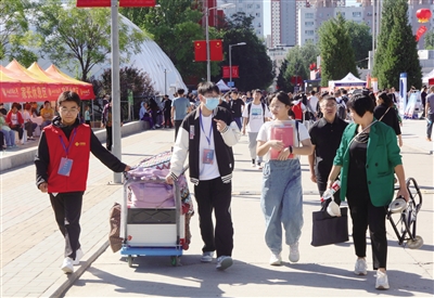图为昨日,校园志愿者为新生及家长提供贴心服务。 本报记者 韩堃 摄