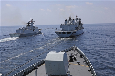 中国海军第45批护航编队在任务准备期间组织航行补给训练(8月24日摄)。