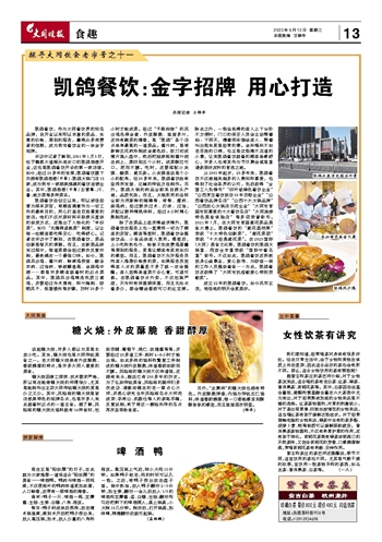 凯鸽餐饮自创立以来,即以诚信经营为根本宗旨,将顾客满意作为一切工作的最终目的,用心打造老百姓喜爱的饭店。他们不仅对原材料采取源头直供的供货方式,还推出了人性化的“半份菜”,实行“无障碍退换菜”制度,以让每一位顾客都吃得安心、吃得舒心。记者在采访中了解到,在凯鸽餐饮,菜品创新是每天的课题。而且,在新菜品研发过程中,每道菜都会经过数次反复炒制,最终确定一个最佳口味。如今,凯鸽风沙鸡、酱汁肉、鲜椒鸡捞面、酸汤羊肉、过油肉、铁板鲽鱼尾、金蒜鸡中翅……都是许多顾客就餐时的必点菜品。其中,凯鸽风沙鸡精选优质三黄鸡,并要经过冷水浸泡、料汁腌制、防晒风干、低温慢炸等步骤,历时20多个小时才能成菜。经过“千般淬炼”的风沙鸡色泽金黄、外皮酥脆、里面多汁,还伴有蔬菜的清香,是“凯鸽”各个店点单率最高的一道菜品。酱汁肉,是将新鲜五花肉炸制成金黄色后,改刀切成薄片装入盘中,然后把独家秘制酱汁浇在肉上,蒸四到五个小时。成菜酥烂可口,肥而不腻。吃时,还要搭配小夹馍、酸菜、黄瓜条。小夹馍虽说是个小小的配角,但20多年来,凯鸽餐饮始终坚持用发面、兑碱的传统方法制作。另外,凯鸽火锅的肉品全部来自源头产地,品质优良。而且,火锅所用的汤料全部为用新鲜的猪棒骨、脊骨、瘦肉、柴鸡肉,经过数次过水、打沫、过油,并配以数种精挑味料,经过8小时精心熬制而成。
