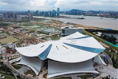 南沙国际金融论坛(IFF)永久会址屋面结构为空间桁架结构体系,以纯白金属屋面为“花瓣”,以玻璃采光屋顶为“花蕊”,共同构成一朵盛开的木棉花(无人机照片,9月13日摄)。