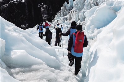 ▲ 9月15日,来自中国的游客在新西兰南岛西海岸福克斯冰川徒步。