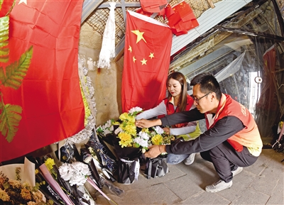 图为云冈区社区戒毒康复服务中心工作人员和志愿者在万人坑遗址为死难矿工敬献鲜花。
