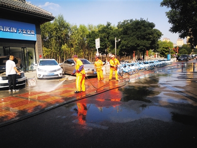 “这附近有多个饭店,所以便道上的油污很重,不及时清理会有异味。”记者在北魏明堂遗址公园附近看到,3名环卫工正在冲洗便道上的油污,其中一人从多功能小型电动冲洗车上拿下高压水枪冲洗地面油污,另外两人配合着清理较难冲洗的油污。在振兴街便民市场周边,环卫工拿着高压水枪仔细冲洗着地面,冲洗过的地面露出了本色。据该中心有关负责人介绍,经过了一个夏天的热闹,一些路段的地面出现了较难清理的油污,尤其是饭店、集贸市场周边地面,油污较为明显。该中心科学运用作业车辆,结合道路实际情况,合理编排车辆组合,采取高压冲洗在前、多功能洗扫在后的“组团”模式对道路进行“冲、洗、扫、洒”作业,全面达到车过地净、路见本色、深度保洁的效果,不断提升道路洁净度。