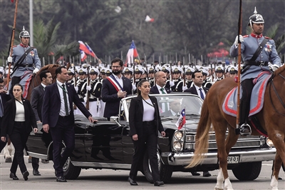 ◀ 9月19日,在智利首都圣地亚哥,智利总统博里奇参加了陆军节阅兵式。