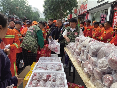 7时许,平城区环卫服务中心的环卫工人刚刚结束了普扫工作,就被邀请到古城内一家饭店吃早餐。凉拌小菜、现炸油饼、月饼……坐在餐桌前享受着美味的早餐,环卫工人们脸上露出了甜甜的微笑。“不够再加,管够管饱啊!大家不要客气……”提前知道饭店的爱心举动后,市退役军人志愿者协会的志愿者也来帮忙,他们和饭店员工一起热情地招呼着每一位环卫工。吃过早饭,志愿者和饭店员工将提前采购的月饼、苹果、麻酱、八宝粥等物品分袋装好,将一袋袋中秋礼物送到环卫工人手上,并向每一位环卫工人致以节日的问候和祝福。一份份来自社会的关爱和祝福,让环卫工人们暖意十足。
