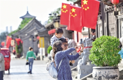 图为昨日游客在鼓楼西街国旗下拍照。 本报记者 张占兵 摄