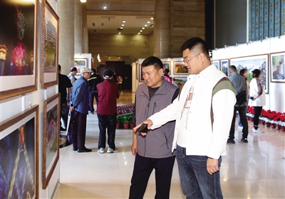 为庆祝中华人民共和国成立74周年,由灵丘县委、县政府、县文旅局主办,市摄影家协会协办的“灵山秀水晋美灵丘”摄影展,昨日上午在大同市规划展览馆开展,展览共收到影友投稿400余幅,从中挑选出150幅展示灵丘自然风光、风土人情、历史古迹和县城新貌的作品进行展出,展览将于10月7日结束。图为游人正在欣赏展出的摄影作品。