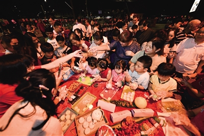 9月27日,在马来西亚马六甲州丹绒吉宁举办的中秋晚会上,人们参加制作月饼活动。