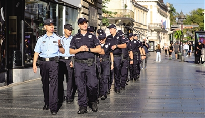 9月28日,在塞尔维亚首都贝尔格莱德,中塞两国警察在街头联合巡逻。