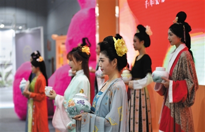9月28日,在2023湖南(醴陵)国际陶瓷产业博览会上,汉服爱好者在展示陶瓷。