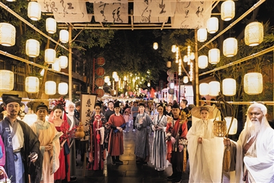 在成都宽窄巷子新“十二月市”街区,装扮成唐宋时代人物形象的演员在巡游表演(9月29日摄)。