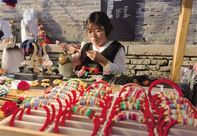 在古城内的非遗文化体验馆,摆放着琳琅满目的手工编织品,展示着由学员制作的钩编作品,一针一线,一钩一绕,非物质文化遗产与残疾人勤劳上进完美融合。走进东南邑历史文化街区,便可以看到摆放着“向阳花计划”的立牌,残疾人学员手工编织者专注于自己手中的线绳,在现场不停编织,王丽娜进行现场教学,形成了工学结合、强化技能、订单培养的模式,将“指尖技艺”转变为“指尖经济”。残疾人通过双手获得自身价值感与成就感,在技能打磨中建立自信,提升就业增收能力。