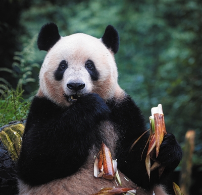 10月8日,大熊猫“香香”在中国大熊猫保护研究中心雅安碧峰峡基地吃竹笋。